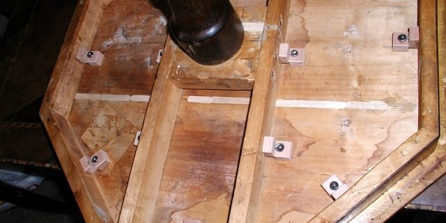 In altre parole, mediante un fissaggio mobile (vite ed occhiello) si garantisce alla superficie una sua stabilità e durata. Nel nostro caso la si ottiene predisponendo cubetti lignei ancorati al piano e alla struttura, per non invaderne l’integrità, quindi con viti ed occhielli inframezzati da rondelle, assicureremo il piano o il fianco al telaio, permettendone il movimento.